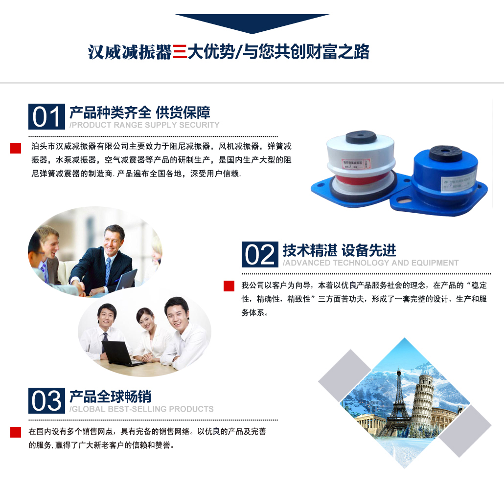 ?泊頭市漢威減振器有限公司主要致力于阻尼減振器,風(fēng)機(jī)減振器,彈簧減振器,水泵減振器,空氣減震器等產(chǎn)品的研制生產(chǎn),是國(guó)內(nèi)生產(chǎn)阻尼彈簧減震器的制造商,產(chǎn)品廣泛用于中央空調(diào)、通風(fēng)管道、鋼鐵、發(fā)電、石化、水泥和城市供熱等行業(yè)的各類(lèi)管道和設(shè)備上,并在全國(guó)多地工程上得到應(yīng)用,業(yè)績(jī)遍布全國(guó)多地,深受用戶信賴. 公司主要減振器系列產(chǎn)品有:中央空調(diào)系列減振器、泵房系列減振器、管道系列減振器、風(fēng)機(jī)系列減振器、以及自行設(shè)計(jì)制作的系列隔振臺(tái)座。泊頭市漢威減震器科技有限公司擁有多名高素質(zhì)技術(shù)人員,擁有完善的阻尼彈簧減震器生產(chǎn)和檢驗(yàn)專(zhuān)用設(shè)備,擁有硅橡膠自動(dòng)擠出生產(chǎn)線,全自動(dòng)彈簧機(jī)等設(shè)備。生產(chǎn)條件逐漸完善進(jìn)步,努力擴(kuò)大生產(chǎn)規(guī)模,提高泊頭市減震器科技有限公司的生產(chǎn)競(jìng)爭(zhēng)力。 多年來(lái)漢威減振器以三誠(chéng)作為公司的字號(hào),旨在立足當(dāng)前......